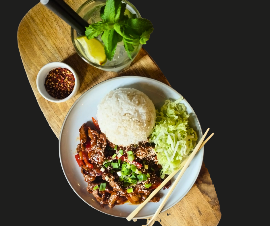 Opalany tuńczyk w oleju sezamowym, sosie sojowym i togarashi/ ryż do sushi/ ogórek/ marynowana marchew/ kiełki/ edamame/ marynowana rzodkiew/ sezam/ sałatka wakame/ wasabi majo/ imbir.