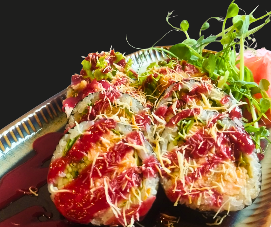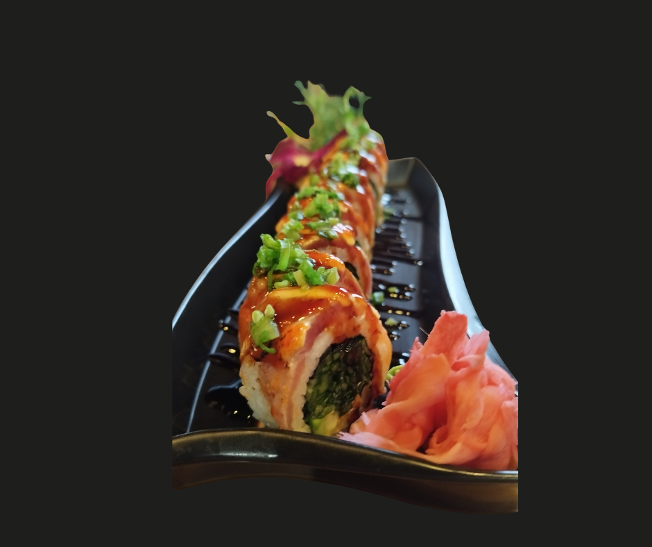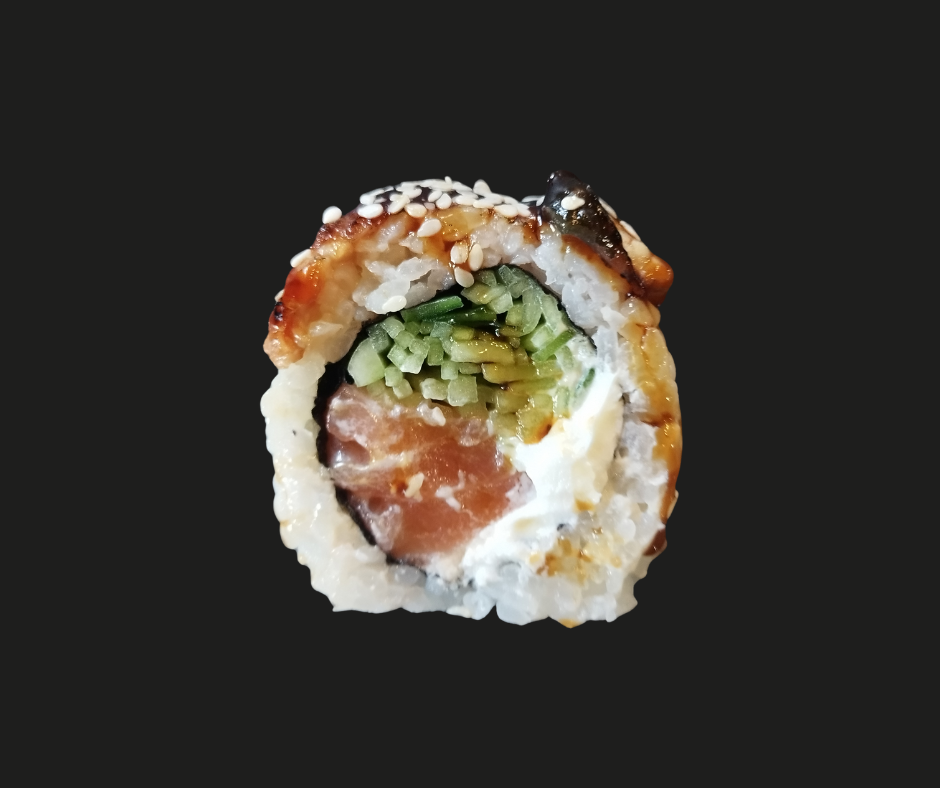 Ogórek/ majonez/ awokado/ krewetki w tempurze owinięte opalanym łososiem, polane sosem teriyaki. -