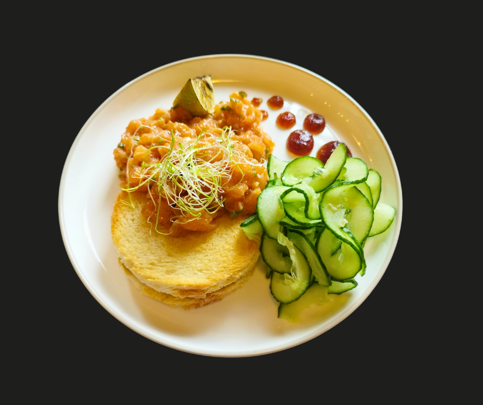 Sałata/ ogórek/ tatar z łososia/ masago arrare/ szczypior -